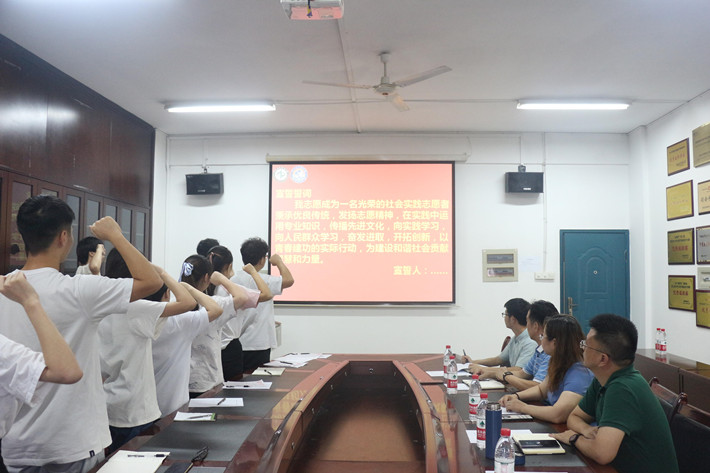 仪式第三项,实践团成员代表邓永东带领全体成员宣誓“我志愿成为一名光荣的社会实践志愿者,秉承优良传统,发扬志愿精神,在实践中运用专业知识,传播先进文化,向实践学习,向人民群众学习,奋发进取,开拓创新,以青春建功的实际行动,为建设和谐社会贡献智慧与力量。宣誓人:”誓词志气盎然,荡气蓬勃,宣誓着我们不怕艰辛,立志实践,为振兴乡村贡献一份力量的精神。