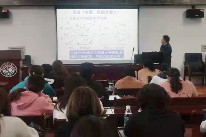 夏扬坤博士做了题为“考虑客户分级和需求可拆分的生鲜车辆路径问题及其禁忌搜索算法”的学术报告。首先就研究创新点展开讲述,即模型上考虑了需求问题、算法上进行了相应的改进。再从数学建模、算法设计、算例测试及对比分析四个角度深入分析了考虑客户分级及需求依背包拆分的生鲜车辆路径问题。